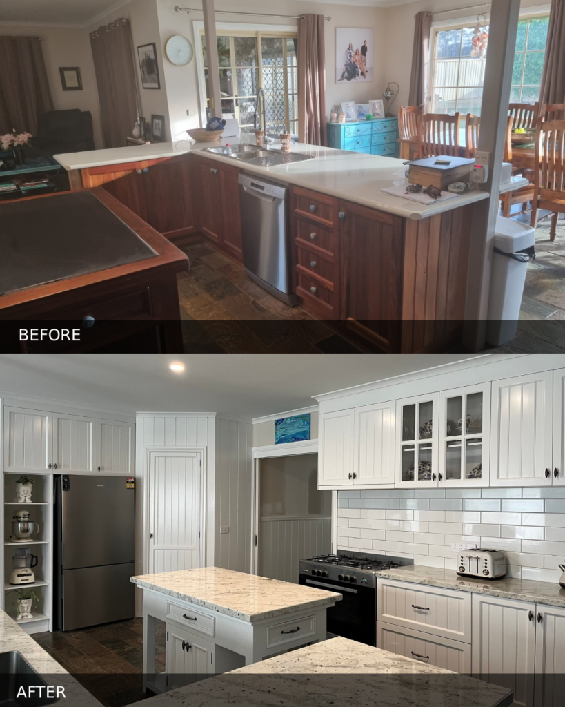 We offer unlimited solid colour matching for kitchen cabinetry – any colour you choose. This is one of our standout differences and gives you complete control to create the exact look you want. Bench tops are as per our sample colours.